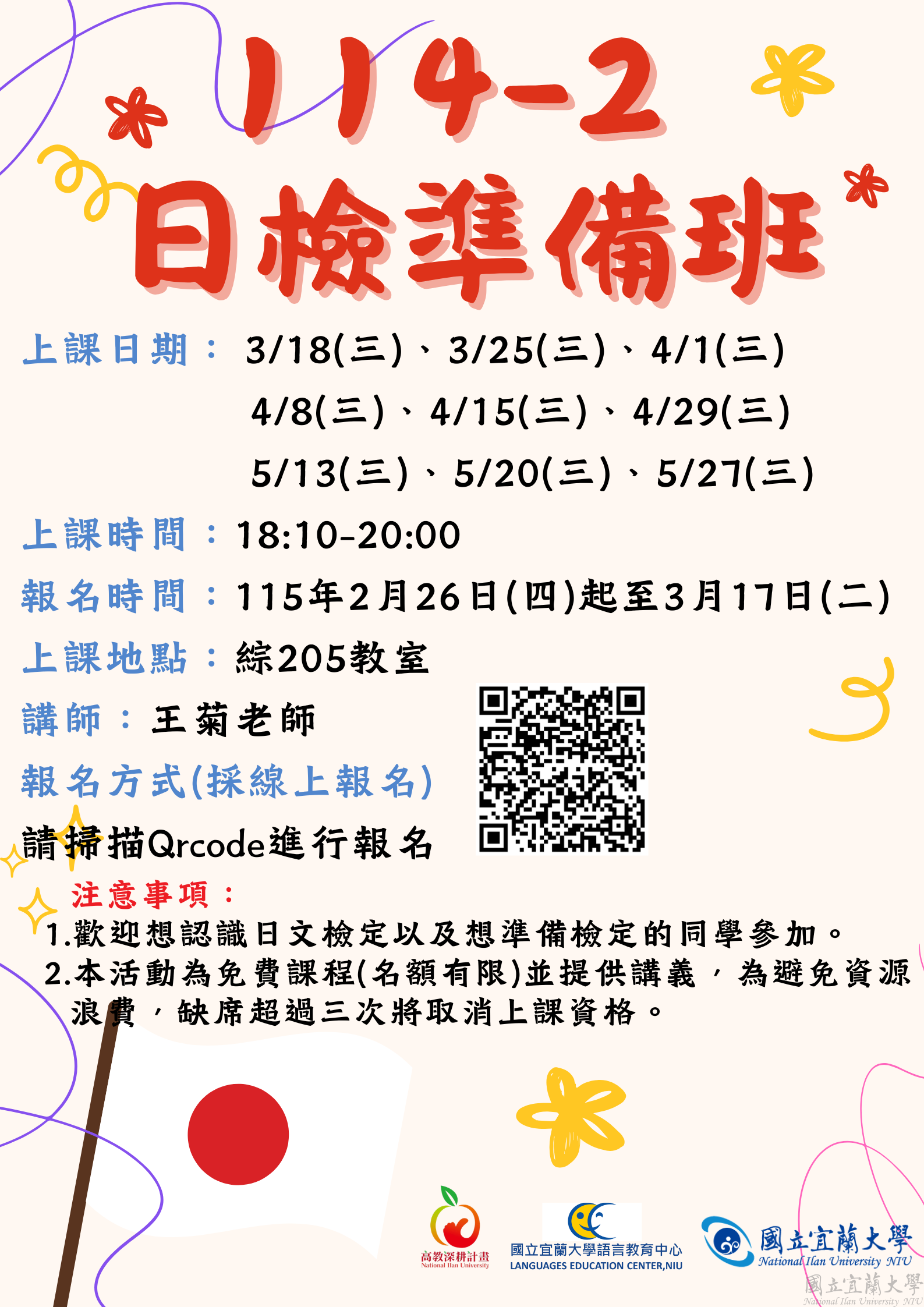 114-2 日檢準備班報名時間:即日起至3月17日(二)止