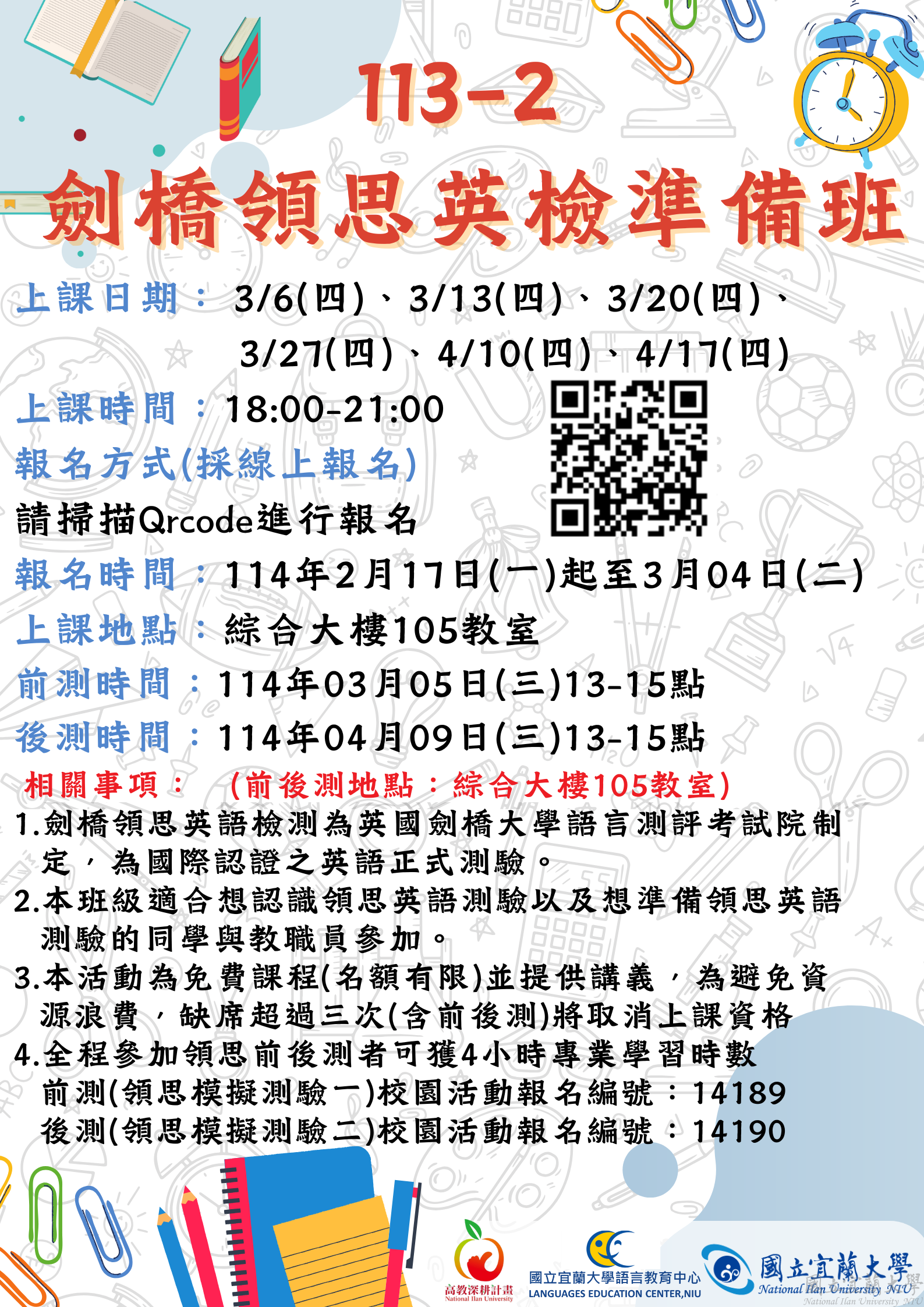 【113-2 劍橋領思英檢準備班】上課教室於3/13起改至綜104上課~劍橋領思英檢準備班即日起開始報名~報名時間:114年02月14日(五)-03月04日(二)-延長報名至3月6日下午13:00