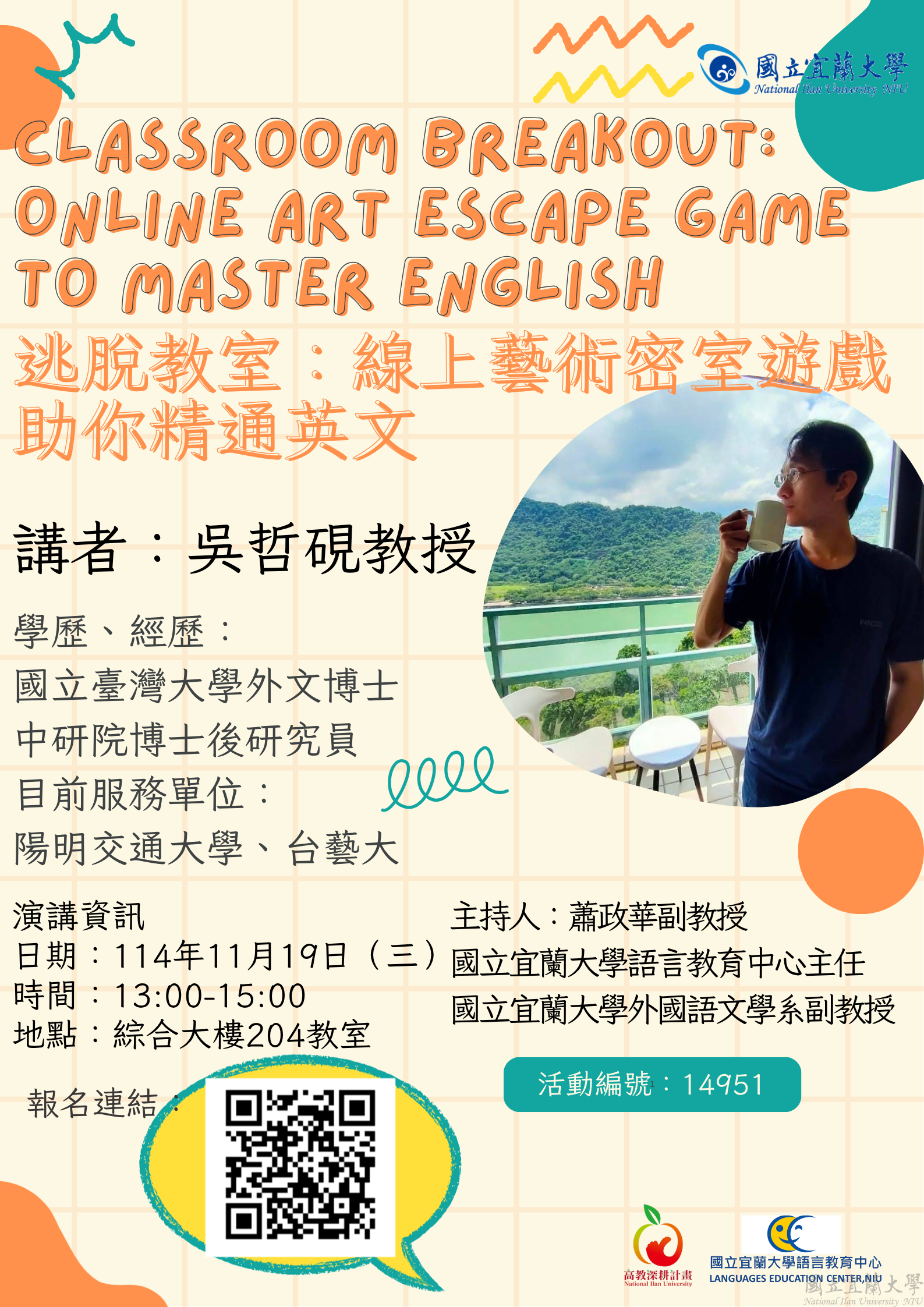【語言教育中心演講活動】114年11月19日(三)線上藝術密室遊戲助你精通英文Classroom Breakout: Online Art Escape Game to Master English