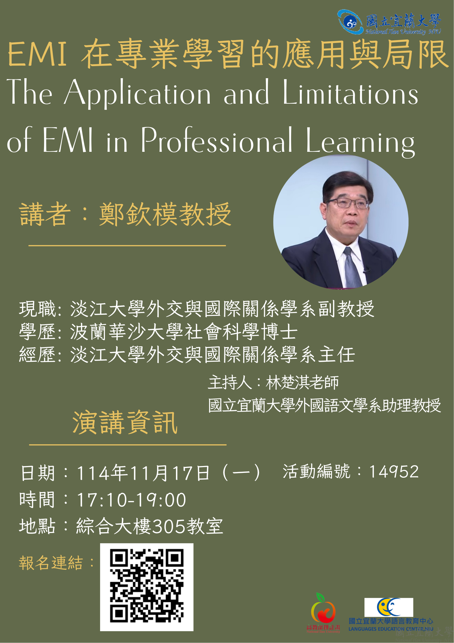 【語言教育中心演講活動】114年11月17日(一)EMI 在專業學習的應用與局限(The Application and Limitations of EMI in Professional Learning)