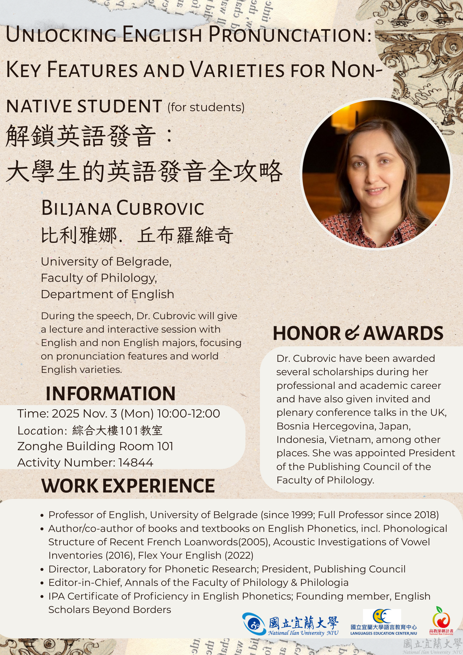 專題演講:解鎖英語發音:大學生的英語發音全攻略 Unlocking English Pronunciation: Key Features and Varieties for Non-native students.