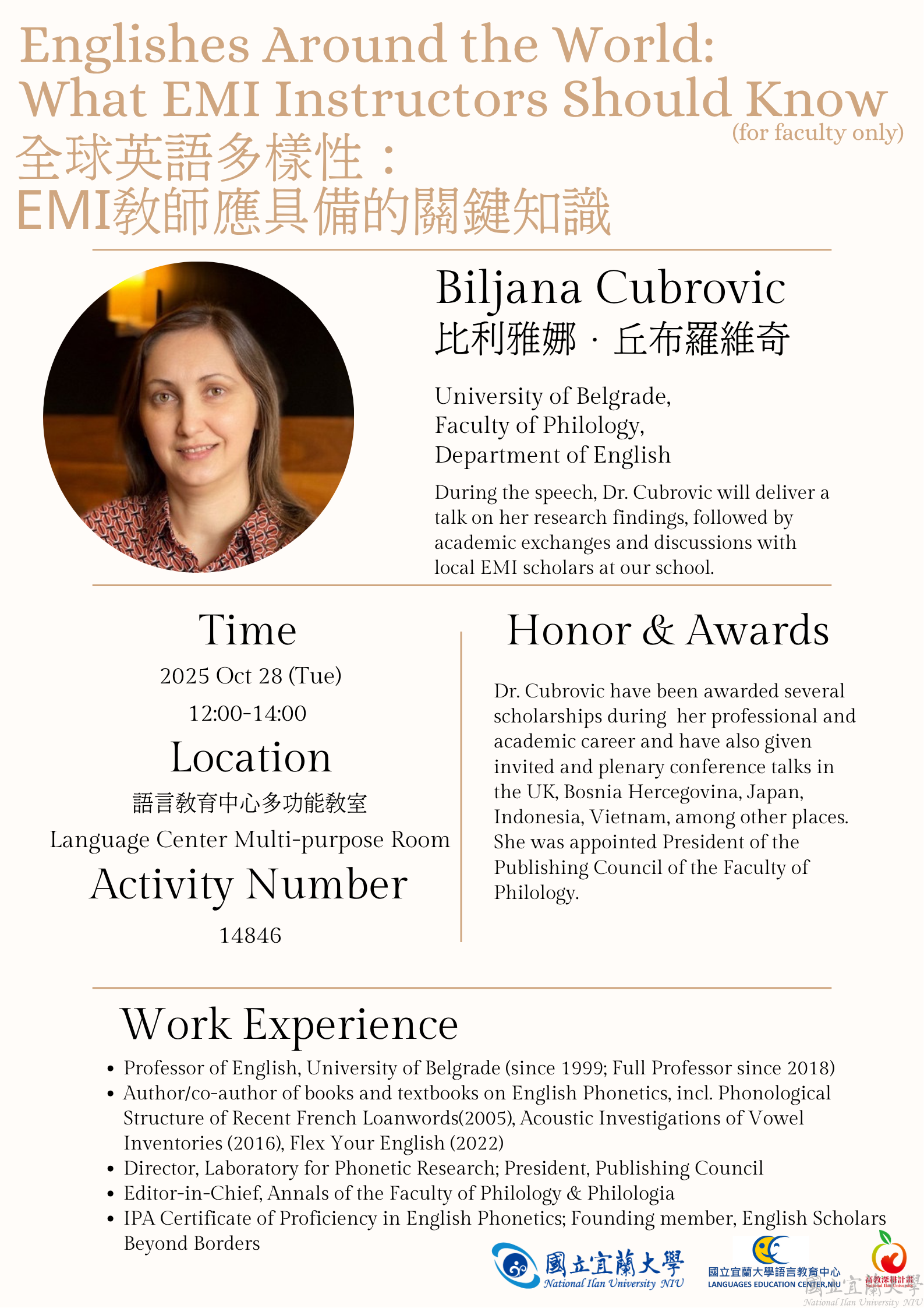 【語言教育中心】114/10/27-10/29及114/11/2-11/3 塞爾維亞Belgrade大學語言與文學學院 Prof. Biljana Cubrovic 蒞校交流