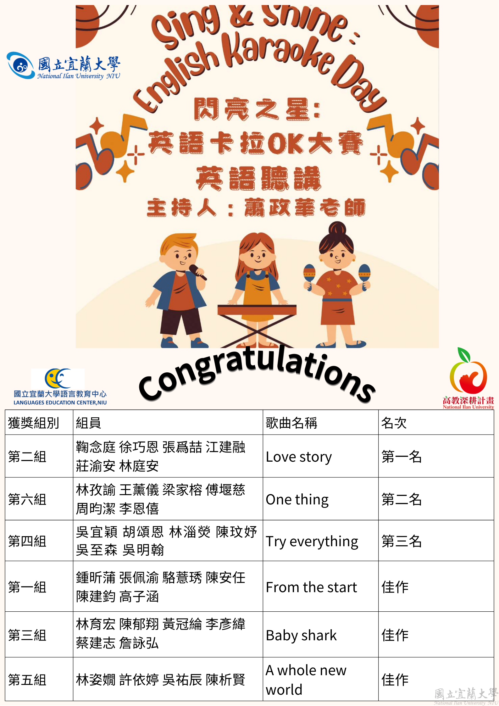 【校內】114-1 ─閃亮之星:英語卡拉ok大賽獲獎名單